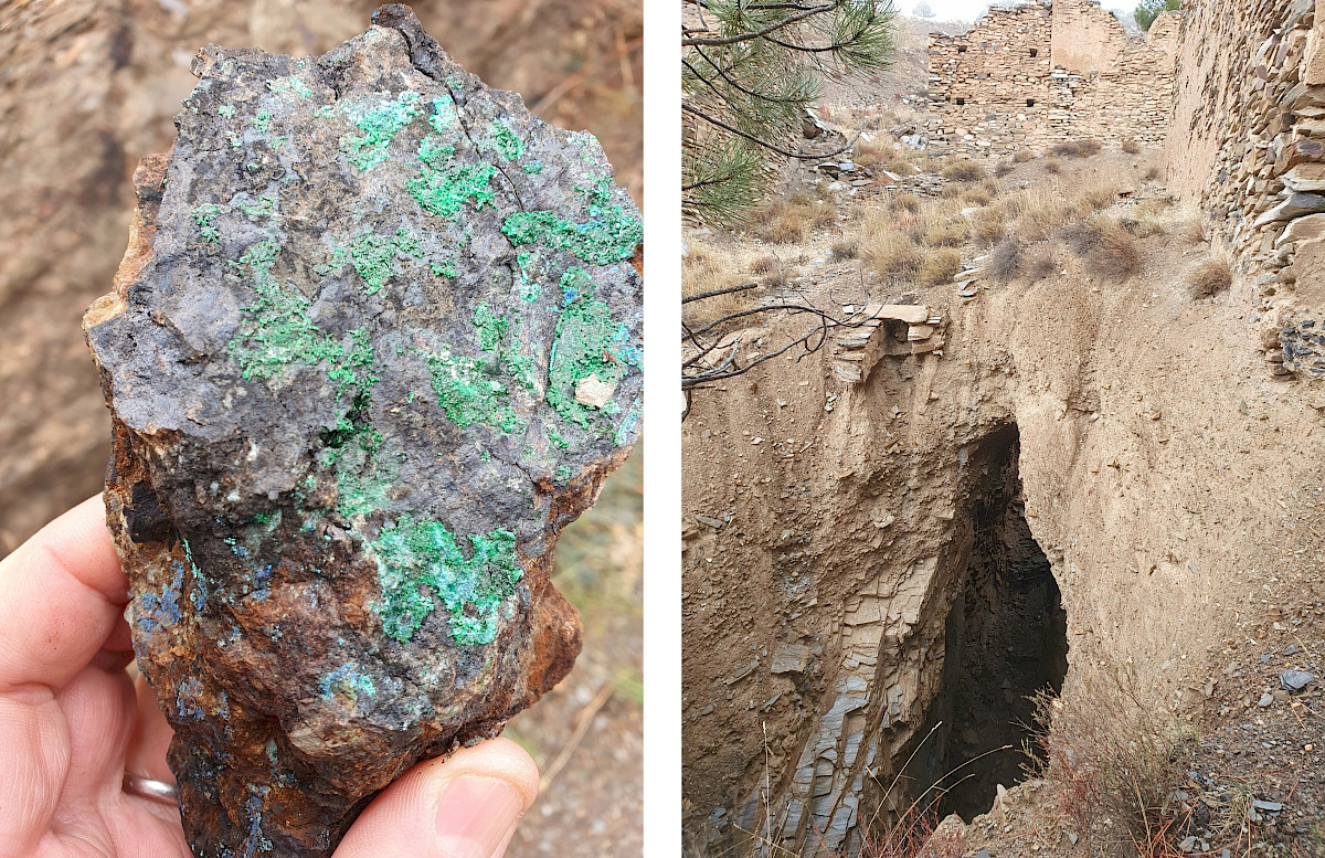 Figure 1. Regional geological setting of the Solana project (Spanish Geological Survey – IGME; LHS), together with an overview of the former Cerro de Gallo mining operations (and an interior view of the main mine access at Cerro de Gallo)(RHS).